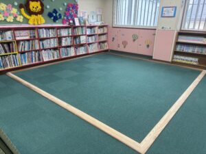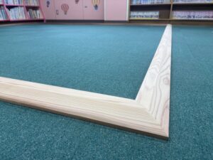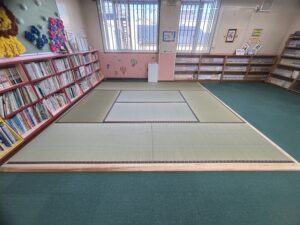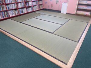児童館から「本を読むスペースに畳を敷きたい」とのご相談をいただき、8帖分の新しい畳を製作・納品いたしました。畳だけを置くと動いてしまうため、木製の枠を特注で作り、その中に畳をしっかりと収めました。出入り口部分はスロープ状に加工し、小さなお子さまでも安心して利用できるよう工夫を凝らしています。安全性と使いやすさを両立させた畳スペースが完成しました。